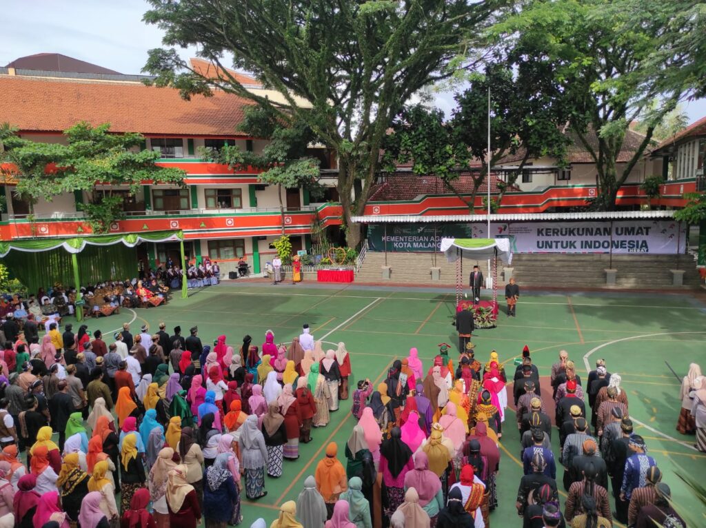 Malang (MAN 2) — Pada peringatan Hari Jadi Kementerian Agama (Kemenag) RI yang biasa disebut dengan Hari Amal Bhakti (HAB) ke-77, Kantor Kemenag Kota Malang mengelar beberapa kegiatan. Semangat kerukunan umat beragama pun tampak kental diwujudkan sejalan dengan tema besarnya yang bertajuk ‘Kerukunan Umat, Indonesia Hebat. Pada Upacara tersebut hadir M. Sailendra , ST, MM selaku Staf Ahli bidang ekonomi dan keuangan yang mewakili Walikota Malang, Kabag Kesra Kota Malang Drs. Achmad Mabrur, dari Kemenag Kota Malang hadir Kasubbag TU Dra. Nurul Istiqomah, para Kasi, ASN Kemenag dan undangan Purnakarya serta pejabat lintas sectoral lainya. Para peserta upacara menggunakan pakaian adat budaya Indonesia sesuai dengan instruksi dari Kementerian Agama RI.