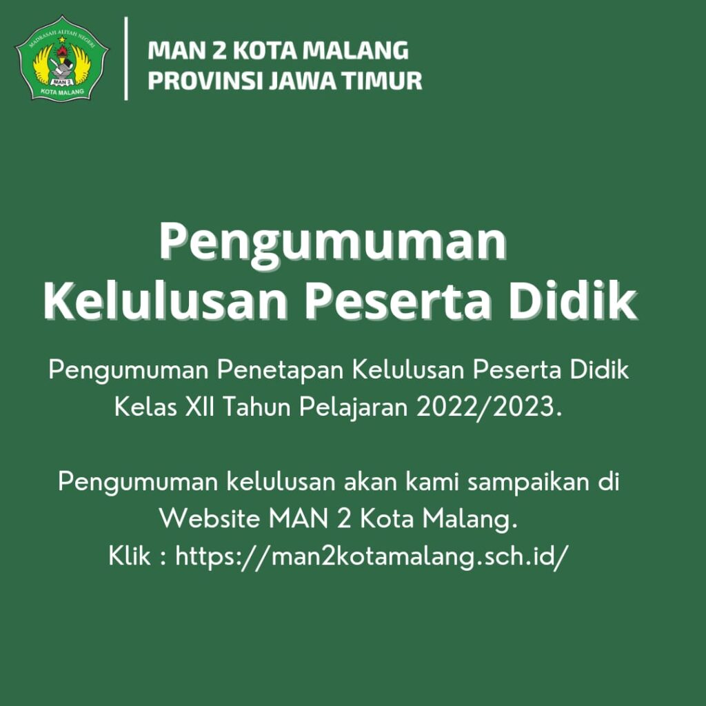 Kota Malang (MAN 2) –Proses Pendidikan selama 3 tahun oleh peserta didik yang saat ini kelas XII di tahun pelajaran 2022/2023 akan berakhir dengan ditandai dengan tahapan Pengumuman Kelulusan. Untuk itu, pengumuman kelulusan akan kami sampaikan di website MAN 2 Kota Malang.