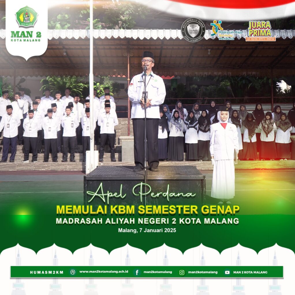 Kota Malang – Mengawali Semester Genap Tahun Pelajaran 2024/2025, MAN 2 Kota Malang menyelenggarakan apel perdana pada Selasa pagi (7/1/25). Kegiatan dilapangan olahraga yang berlangsung khidmat ini dihadiri oleh Kepala Madrasah Dr. H. Samsudin, M.Pd., seluruh Guru dan Tenaga Kependidikan (GTK), serta peserta didik dari semua jenjang kelas.