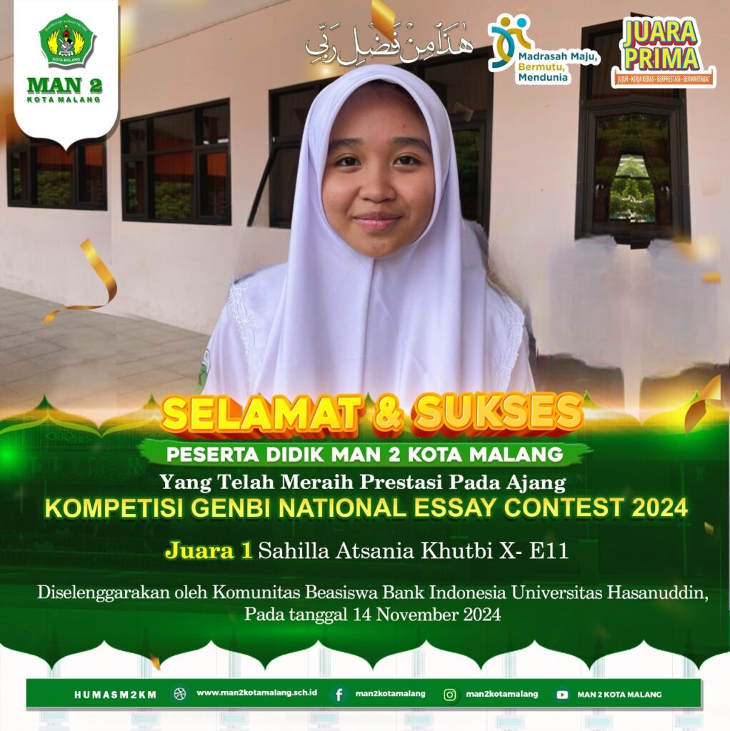 Kota Malang — Peserta didik MAN 2 Kota Malang kembali mengharumkan nama madrasah dengan prestasi tingkat nasional. Sahilla Atsania Khutbi, salah satu peserta didik berbakat, berhasil meraih Juara 1 dalam ajang bergengsi GENBI National Essay Contest 2024. Kompetisi ini diadakan oleh Komunitas Beasiswa Bank Indonesia Universitas Hasanuddin pada 14 November 2024 dan diikuti oleh peserta dari berbagai penjuru Indonesia.