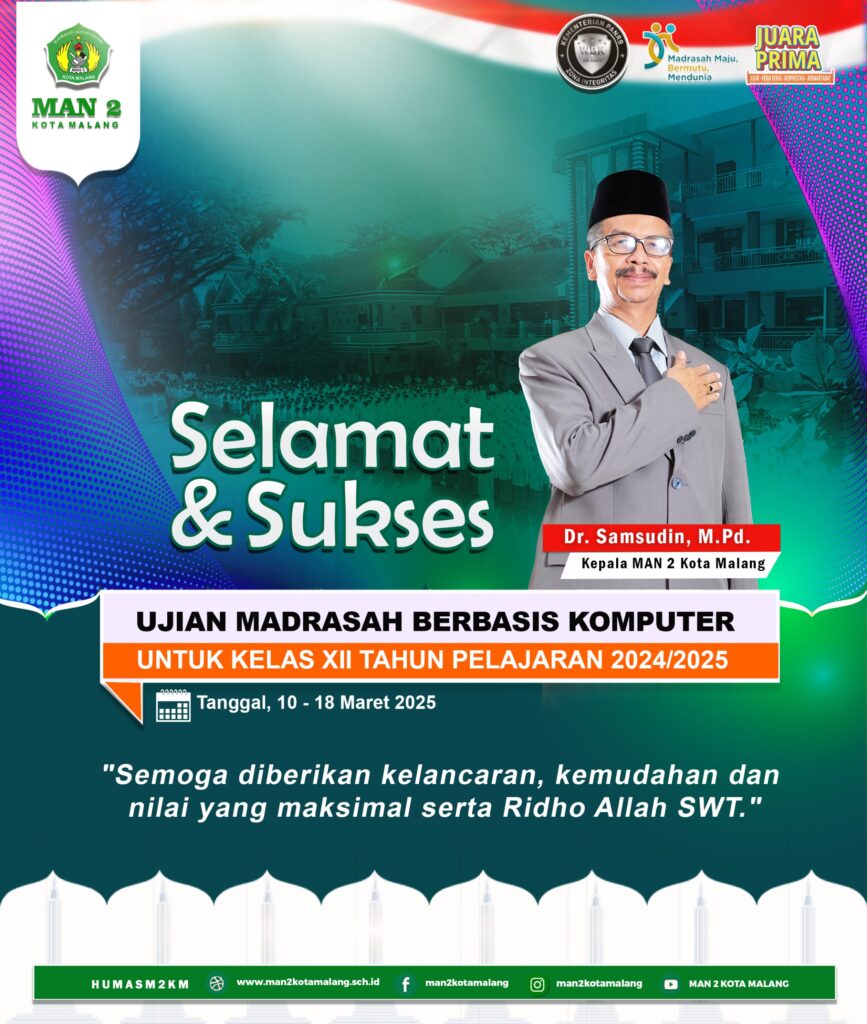 Kota Malang – Madrasah Aliyah Negeri (MAN) 2 Kota Malang secara resmi melaksanakan Ujian Madrasah Berbasis Komputer (UMBK) mulai Senin, 10 Maret 2025, hingga 18 Maret 2025. Ujian ini menjadi momen penting bagi peserta didik kelas XII dalam mengukur capaian akademik mereka setelah menempuh pembelajaran di madrasah.