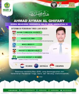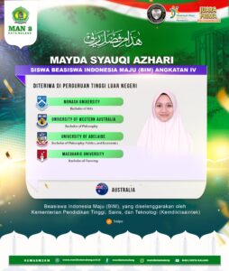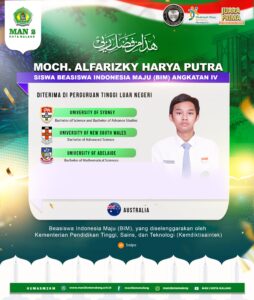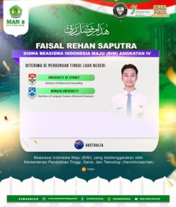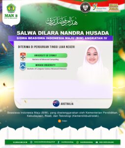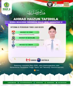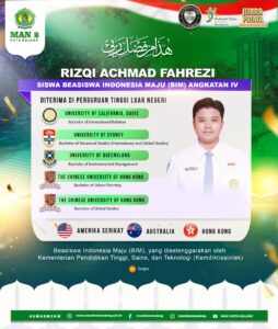 Kota Malang — Prestasi Internasional kembali ditorehkan oleh peserta didik MAN 2 Kota Malang. Sebanyak delapan peserta didik peraih Beasiswa Indonesia Maju angkatan IV tersebut berhasil lolos seleksi masuk berbagai perguruan tinggi ternama dunia dengan program studi bergengsi. Hal ini menjadi bukti nyata kualitas pendidikan dan pembinaan yang diterapkan di MAN 2 Kota Malang dalam mengantarkan peserta didiknya menuju jenjang pendidikan tinggi bertaraf internasional.