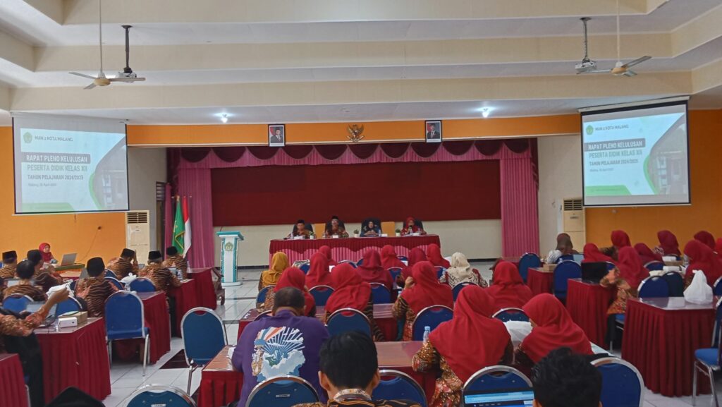 Kota Malang — Madrasah Aliyah Negeri (MAN) 2 Kota Malang menggelar Rapat Pleno Kelulusan Peserta Didik Kelas XII Tahun Pelajaran 2025/2026 pada Rabu (30/4) di Aula PSBB Madrasah. Acara ini diikuti oleh 436 peserta didik dari empat peminatan—Matematika dan Ilmu Pengetahuan Alam (MIPA), Ilmu Pengetahuan Sosial (IPS), Bahasa, serta Madrasah Aliyah Negeri Program Keagamaan (MAN PK). Sidang kelulusan ini juga dihadiri oleh Kepala Madrasah Dr. H. Samsudin, M.Pd., Ketua Kelompok Kerja Pengawas (Pokjawas) Madrasah Kementerian Agama Kota Malang, Dra. Hj. Chusnul Chotimah, M.Ag., serta seluruh guru MAN 2 Kota Malang.