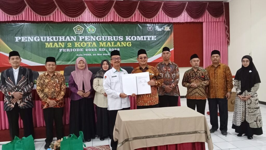 Kota Malang – Kepala Madrasah Aliyah Negeri (MAN) 2 Kota Malang Dr. H. Samsudin , M.Pd. resmi mengukuhkan Pengurus Komite Madrasah periode 2025–2028 dalam sebuah acara yang berlangsung khidmat di Aula PSBB, Selasa (20/5) siang. Pengukuhan ini menjadi simbol dimulainya sinergi baru antara madrasah dan orang tua peserta didik demi kemajuan mutu pendidikan.