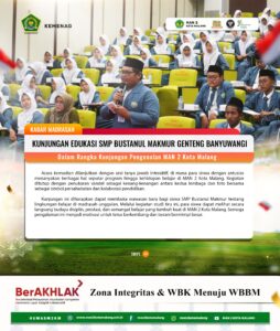 MAN 2 Kota Malang berkomitmen untuk terus menjaga semangat “Juara Prima”. Semoga jalinan silaturahim antara MAN 2 Kota Malang dan SMP Bustanul Makmur Genteng Banyuwangi terus terjaga, membawa keberkahan, dan melahirkan generasi emas penerus bangsa. (MU/ris)