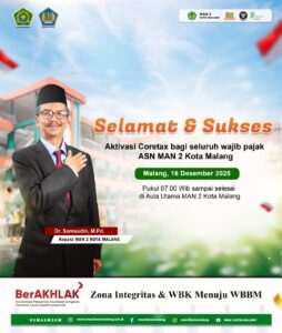 Kota Malang – MAN 2 Kota Malang menyelenggarakan kegiatan Aktivasi Coretax bagi Seluruh Wajib Pajak ASN pada Selasa (16/12) pukul 08.00 s.d. 10.00 WIB. Kegiatan ini bertempat di Aula Utama MAN 2 Kota Malang dan diikuti oleh seluruh Aparatur Sipil Negara (ASN) yang bertugas di MAN 2 Kota Malang. Sosialisasi ini menjadi bagian dari upaya peningkatan pemahaman dan kepatuhan ASN terhadap sistem perpajakan terbaru. Coretax sendiri merupakan aplikasi baru Direktorat Jenderal Pajak yang mengintegrasikan berbagai layanan perpajakan dalam satu sistem untuk mempermudah proses pelaporan pajak.