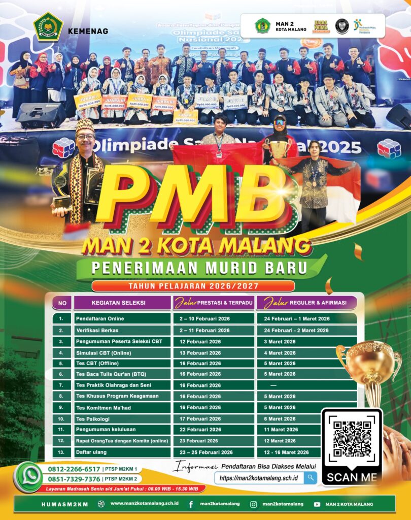 Untuk Penerimaan Murid Baru (PMB) MAN 2 Kota Malang Jalur Prestasi, Terpadu, Reguler dan Afirmasi.
