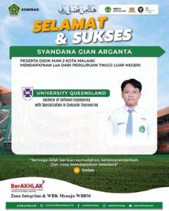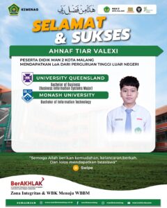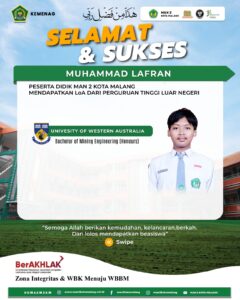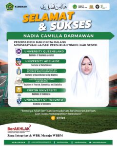 “Kami terus memberikan pembinaan akademik, penguatan bahasa asing, serta pendampingan dalam proses pendaftaran ke perguruan tinggi luar negeri. Dengan persiapan yang matang, siswa MAN 2 Kota Malang memiliki peluang besar untuk diterima di berbagai universitas ternama dunia,” ungkapnya.