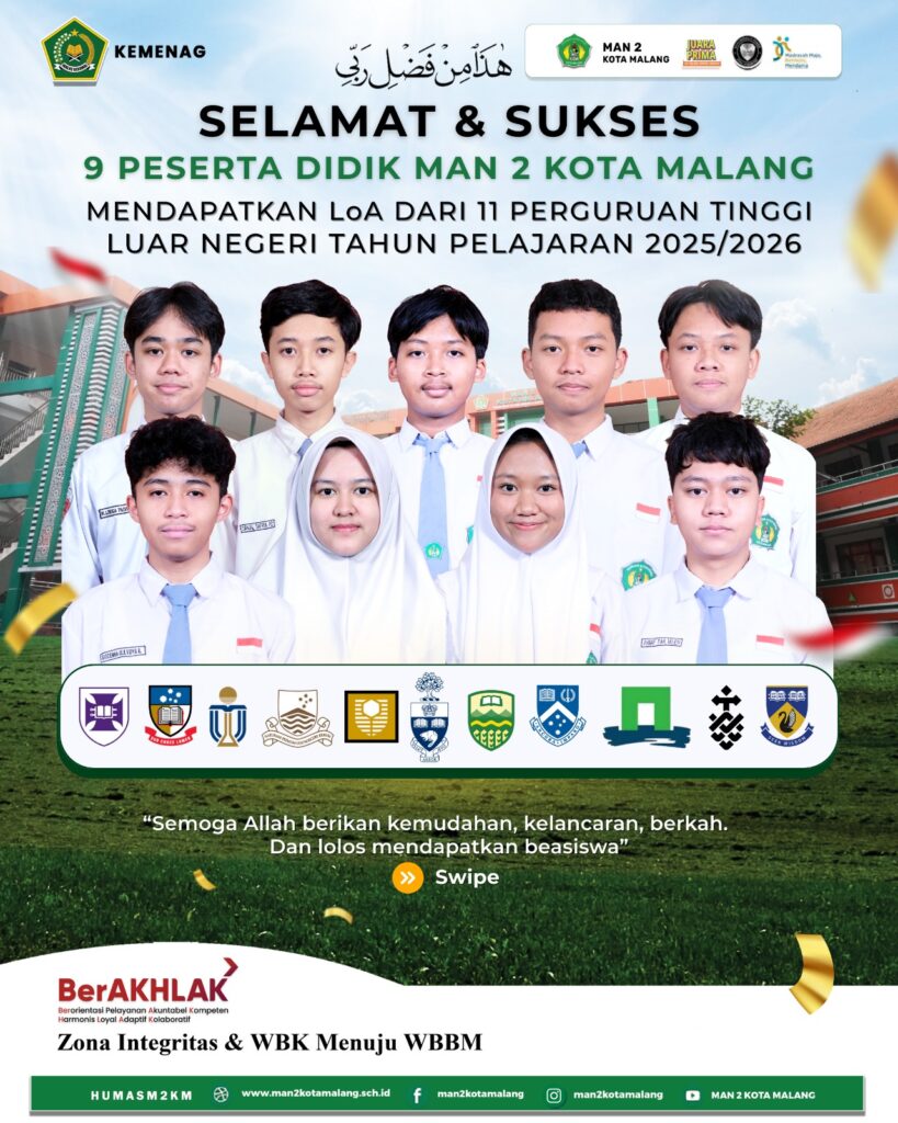 Kota Malang – Prestasi membanggakan kembali ditorehkan oleh peserta didik MAN 2 Kota Malang. Sebanyak sembilan siswa berhasil memperoleh Letter of Acceptance (LoA) dari 11 perguruan tinggi luar negeri pada tahun pelajaran 2025/2026. Capaian ini menunjukkan kemampuan siswa madrasah untuk bersaing di tingkat internasional.