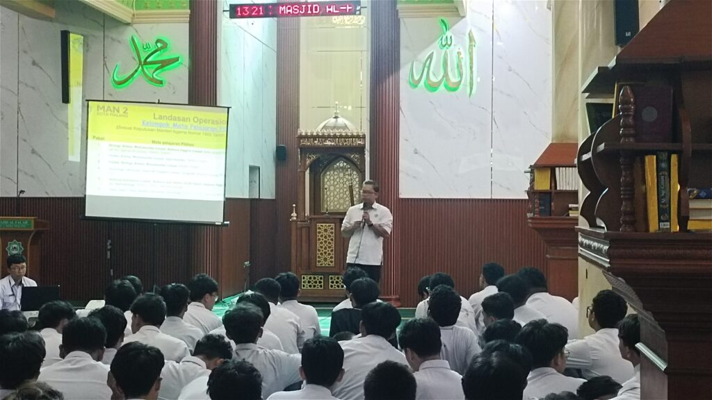 Kota Malang – MAN 2 Kota Malang menggelar Sosialisasi Fase F yang dilaksanakan pada Senin (20/4) pukul 13.00 hingga 15.00 WIB. Kegiatan ini diikuti oleh seluruh siswa kelas X di Masjid Al-Falah sebagai bentuk pengenalan kurikulum yang akan dijalani pada jenjang berikutnya.